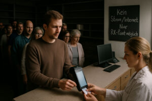Während eines regionalen Internetausfalls kann eine Apotheke keine E‑Rezepte abrufen. Patienten nutzen stattdessen den RX-Point‑Terminal im Kassenbereich, um ihre E-Rezepte über die eGK einzulösen. Die Daten werden als KIM‑Nachricht zwischengespeichert. Sobald der Internetzugang wieder verfügbar ist, werden die E-Rezepte automatisch in das Apothekensystem übertragen, die Medikamente vorbereitet und per Botendienst ausgeliefert oder vom Patienten abgeholt. Ohne Verlust der Verordnung.