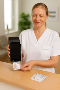 Unser Terminal ermöglicht die sofortige Autorisierung von E-Rezepten (gesetzlich versicherter Patienten) – direkt über die elektronische Gesundheitskarte (eGK). Der Rezeptcode (Token) wird automatisch an die hinterlegte KIM-Adresse übermittelt – also direkt an die Apotheke, mit der die Einrichtung (z. B. ein Pflegeheim) zusammenarbeitet. Ohne Umwege. Ohne Papier. Ohne Zeitverlust.
